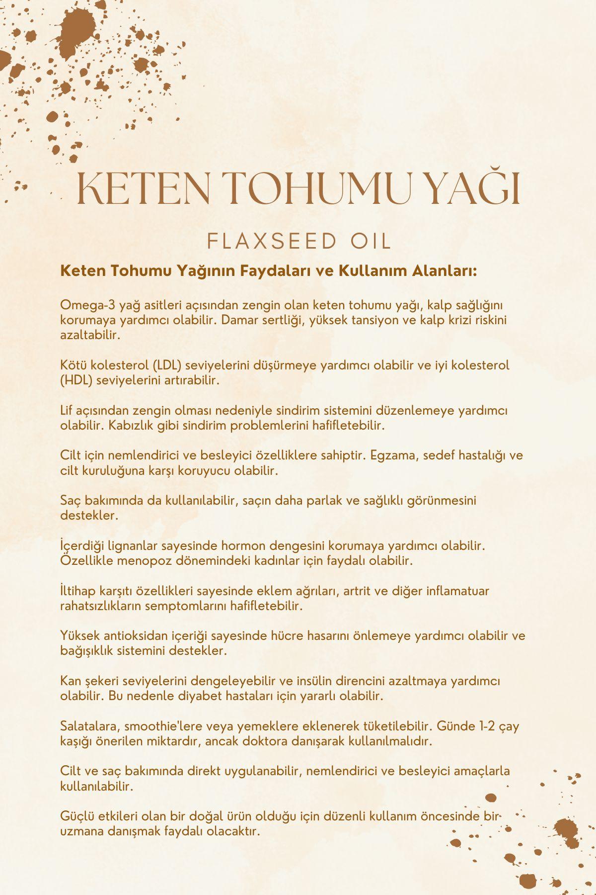Cilt Bakımı:Keten tohumu yağı cildi nemlendirir ve yumuşatır, çörek otu yağı ise ve leke oluşumunu azaltmaya destek olur.